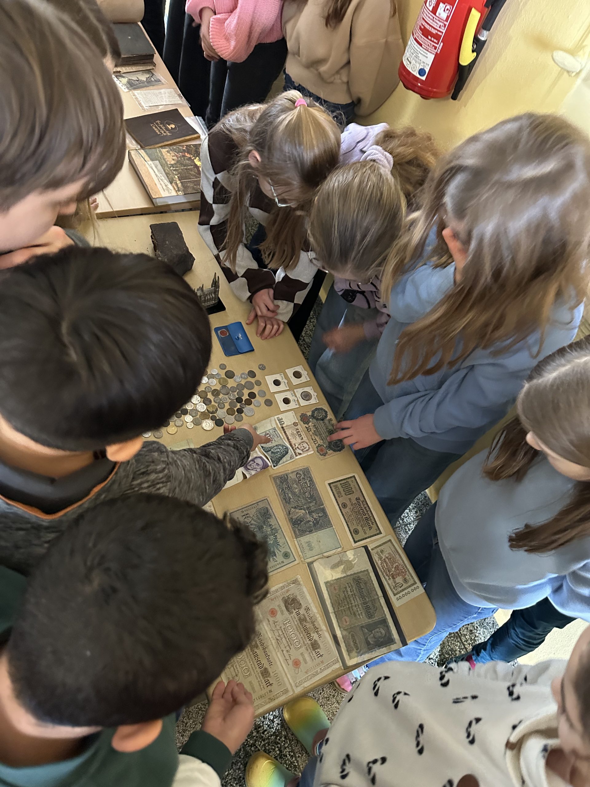 …zu einer „Unterrichtsstunde“ der besonderen Art. Alle vierten Klassen beschäftigen sich derzeit mit der Geschichte von Auerbach. Dies nahmen die Kinder der 4c zum Anlass, mit Eltern und Großeltern in den Untiefen der Keller und Dachböden zu kramen und allerlei „Altes“ mit in die Schule zu bringen. Die Kinder richteten mit allen Materialien ein kleines Museum auf dem Gang ein und luden die 4a und die 4b ein, sich alles genau anzuschauen. Schnell waren die selbstgemalten Schilder „Bitte nicht anfassen“ vergessen und die Kinder animierten sich immer wieder gegenseitig, das Material in die Hand zu nehmen. Besonders beeindruckt waren die Viertklässler von den Geldscheinen und Münzen. Aber auch alte Postkarten aus dem ersten Weltkrieg, ein Kochbuch und ein Plattenspieler faszinierten die jungen Menschen.