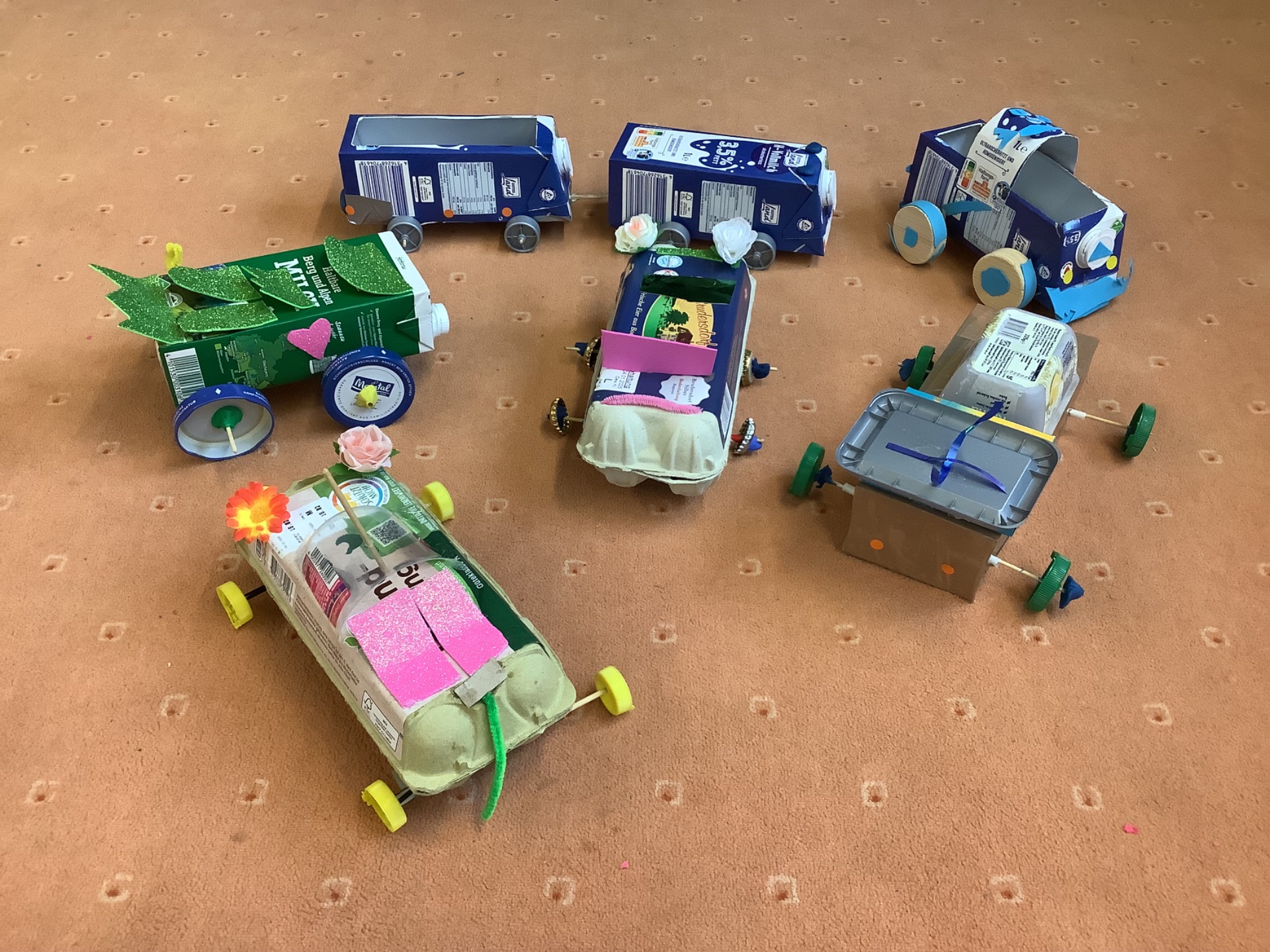 Kurz vor den Ferien stellten die Kinder der zweiten Klassen Fahrzeuge aus Alltagsmaterialien her. Dazu brauchten wir eine Karosserie, vier Räder, eine Achse und ein Lager. Fleißig wurde entworfen, geklebt, gebastelt, verbessert, verziert, geholfen und am Ende aufgeräumt. Ihr könnt raten, was am wenigsten Spaß gemacht hat 🙂 Das Basteln war richtig toll und unsere Fahrzeuge können sich auf jeden Fall sehen lassen.