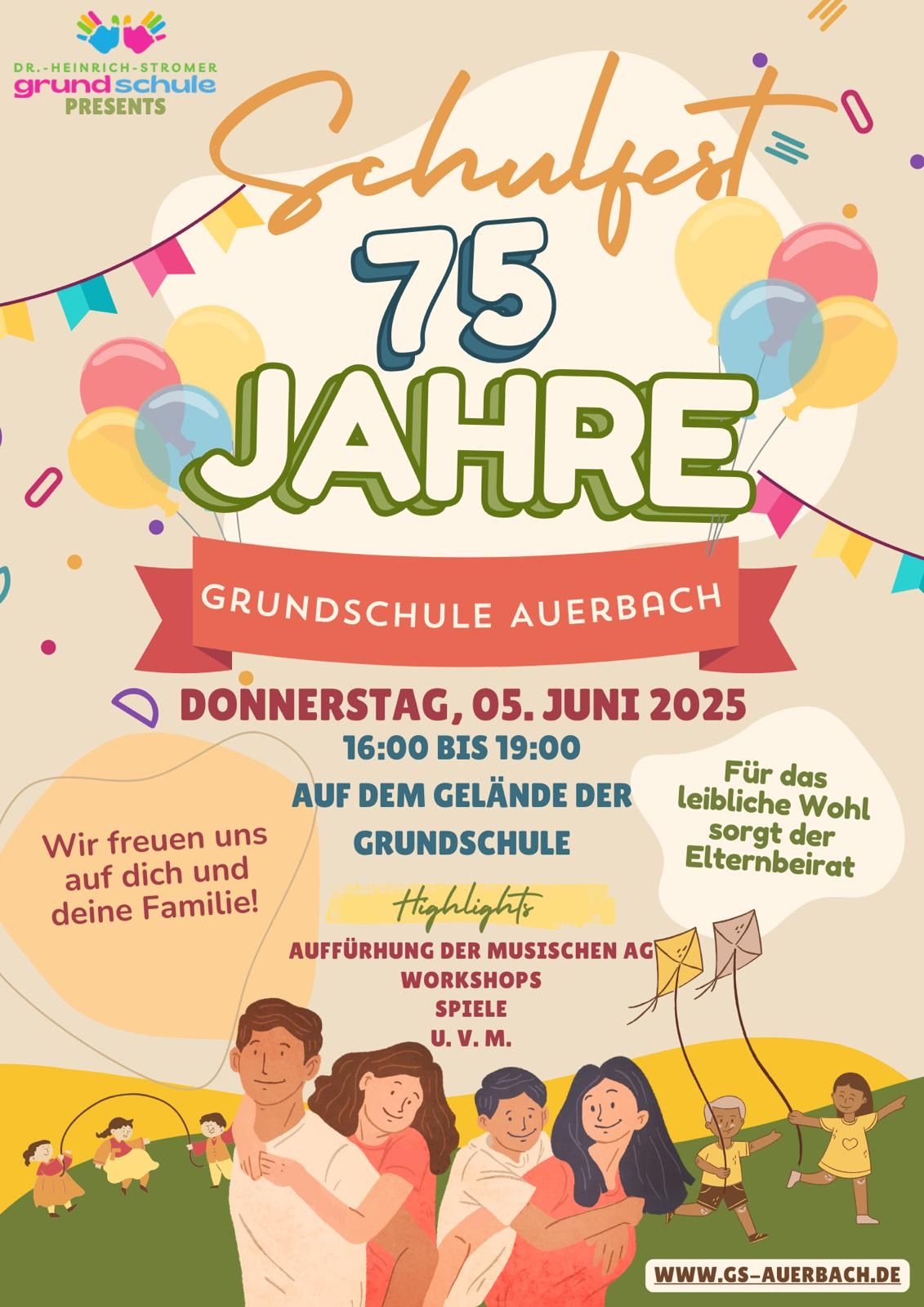 Bei unserem Schulfest zum 75. Geburtstag unserer Grundschule haben unsere Kinder die Möglichkeit, zwischen 17:00 und 19:00 Uhr verschiedene Workshops und Stationen zu besuchen.