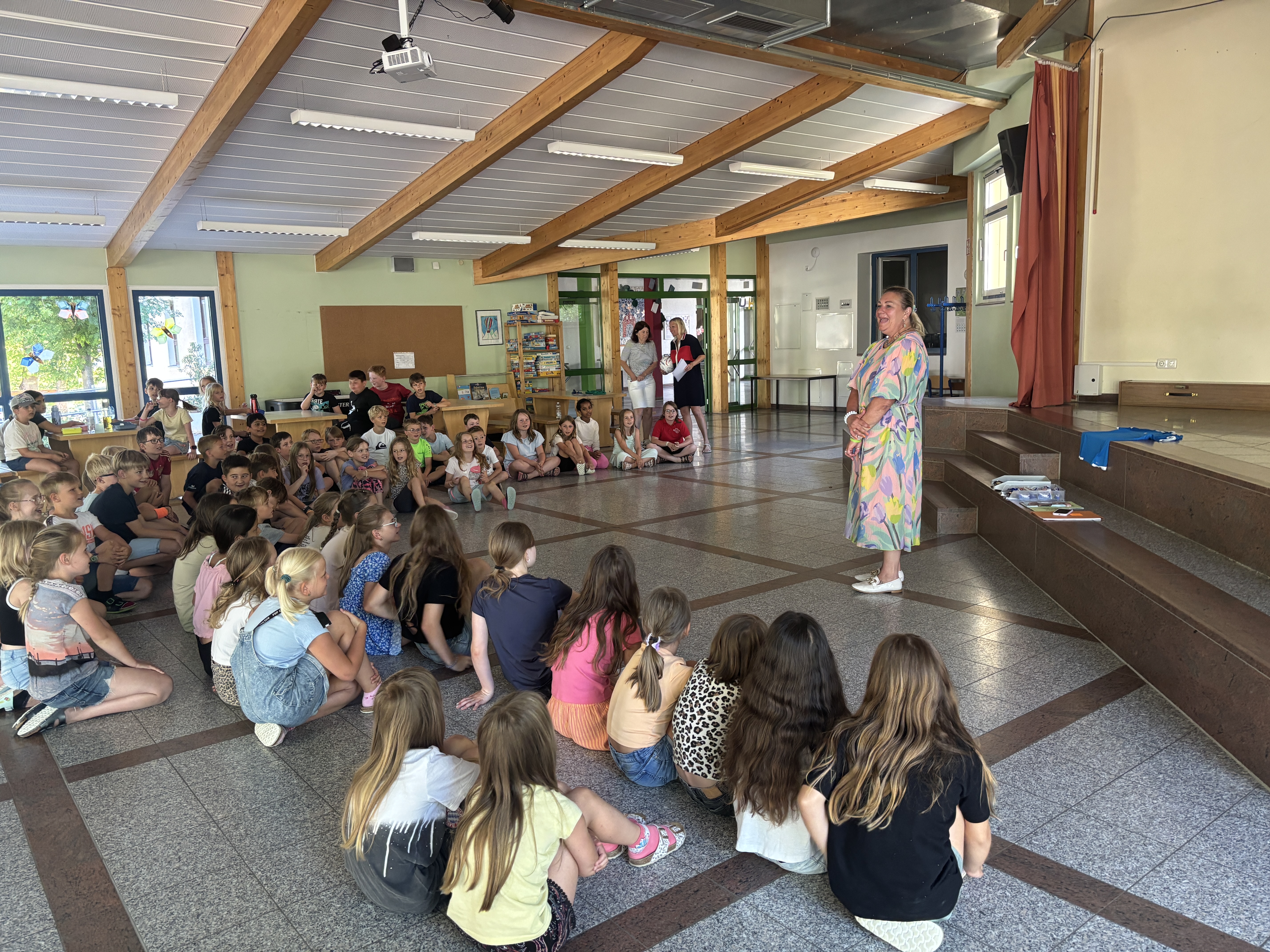 Am Mittwoch nach den Pfingstferien lud Frau Lutye-Küst die Schwimm- und Fußballmannschaften sowie die Kinder der Theater AG zu einer kleinen Feierstunde in die Aula ein. Die Rektorin ließ die sportlichen und schauspielerischen Erfolge noch einmal Revue passieren, gratulierte den Kindern und verteilte an jedes Kind eine Urkunde, ein Erinnerungsfoto, eine Süßigkeit und einen Hausaufgabengutschein zur Belohnung für ihren Einsatz.