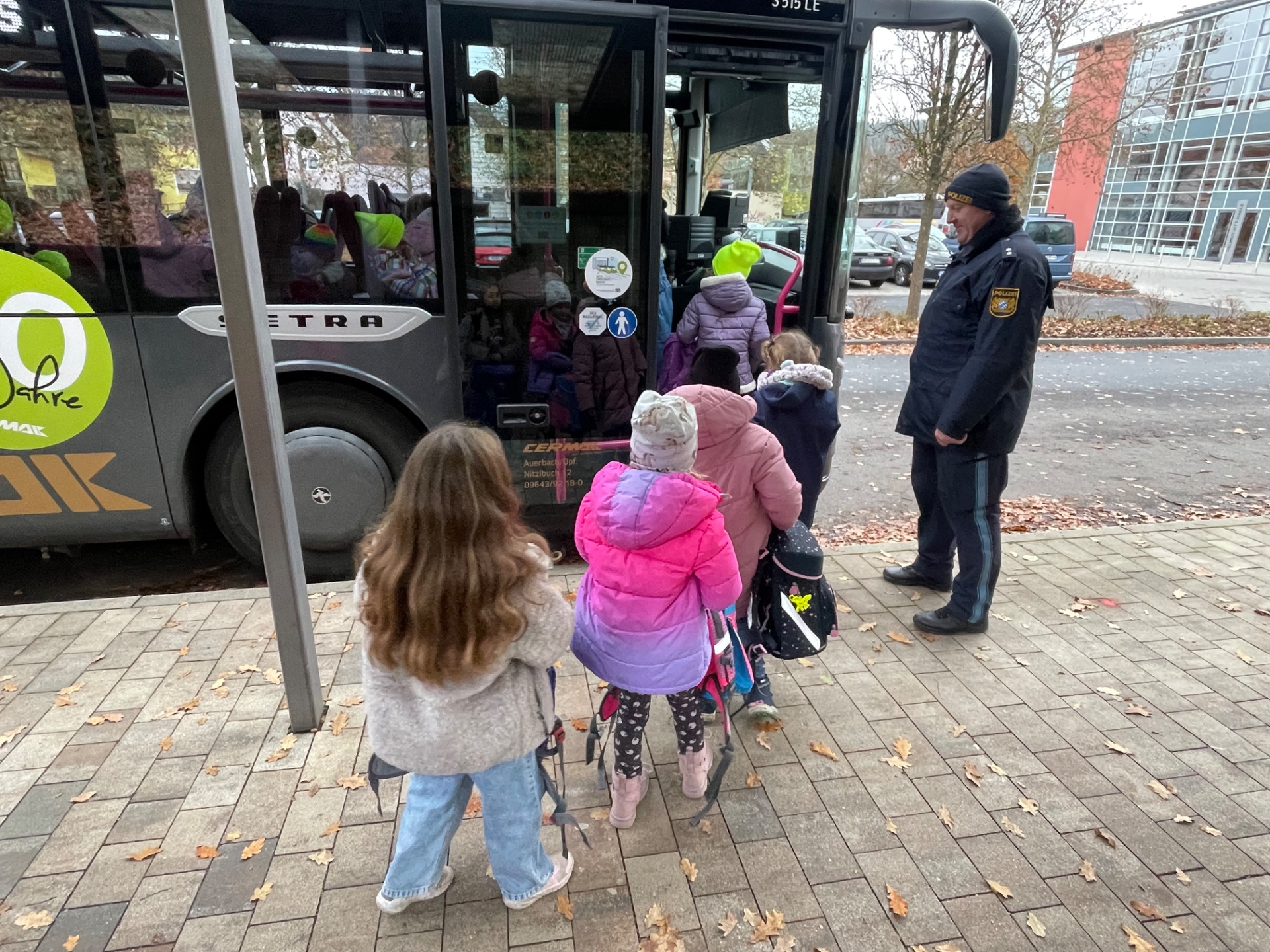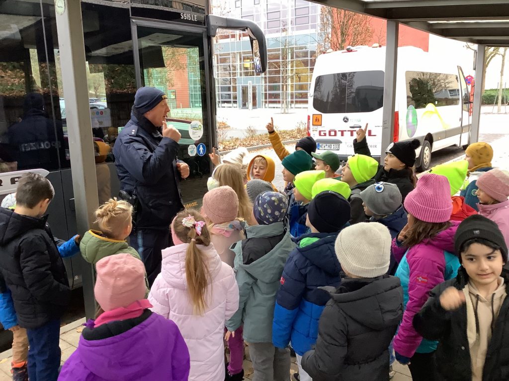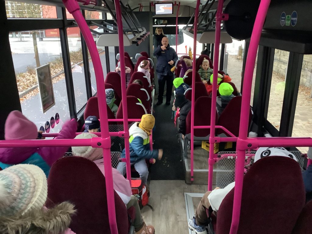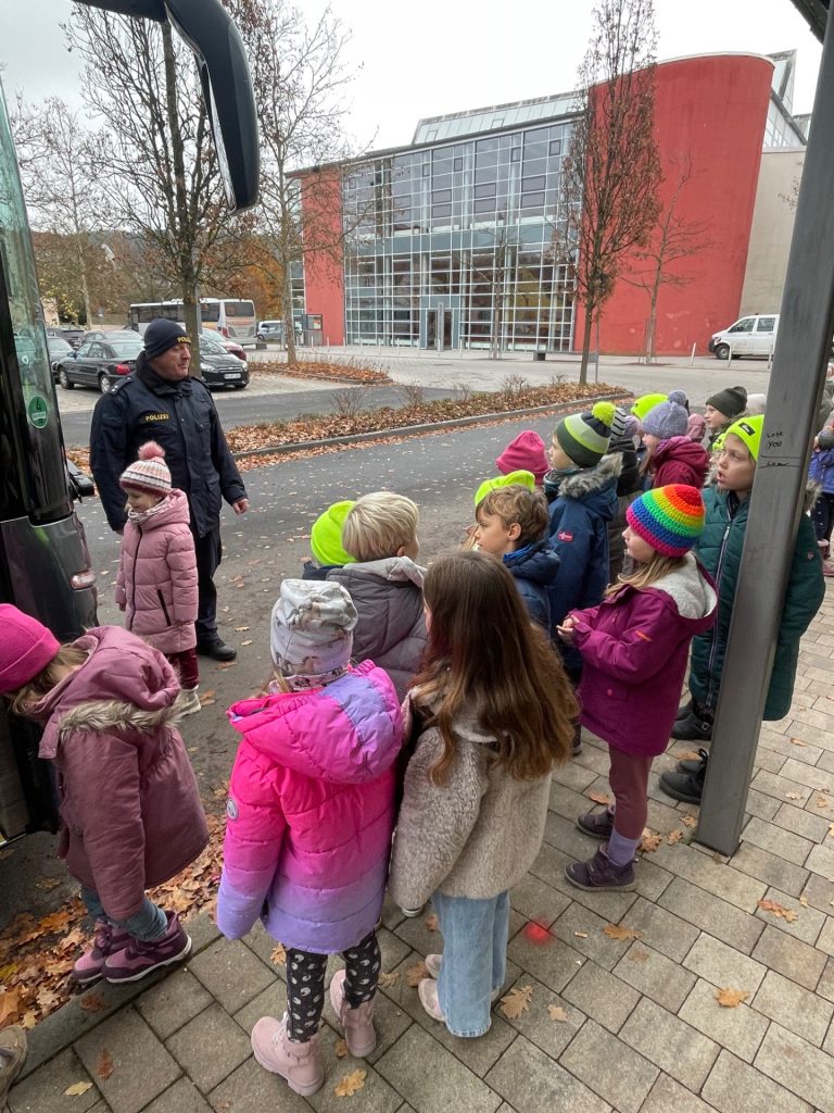 Am Dienstag, den 18.11.25, hatten die Erstklässler „Busschule“, bei der ein Polizist den Kindern den richtigen Umgang mit anderen und das eigene Verhalten an einer Bushaltestelle sowie im Bus erklärt hat. Themen waren ebenfalls das Ein- und Aussteigen, der tote Winkel und auch wenn es um das Überqueren der Straße im Umfeld der Bushaltestelle geht, wissen die Auerbacher Kinder nun Bescheid. Die Schülerinnen und Schüler der ersten Klassen zeigten sich sehr interessiert und machten bei allen Übungen aufmerksam mit.