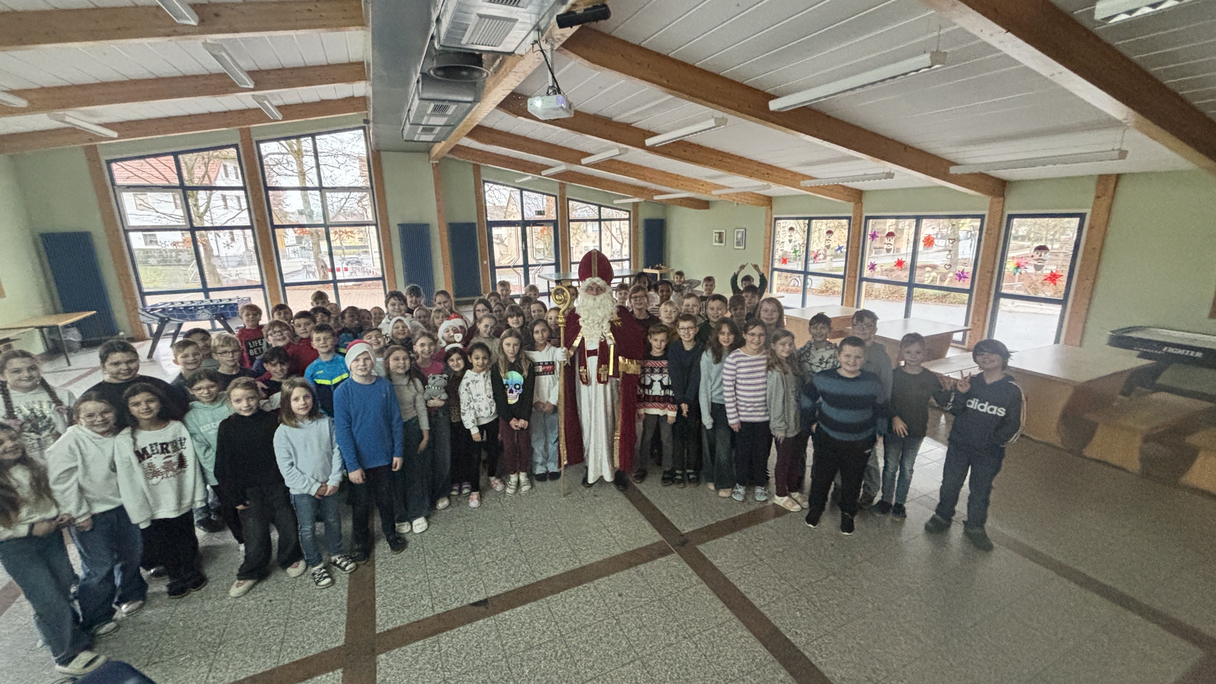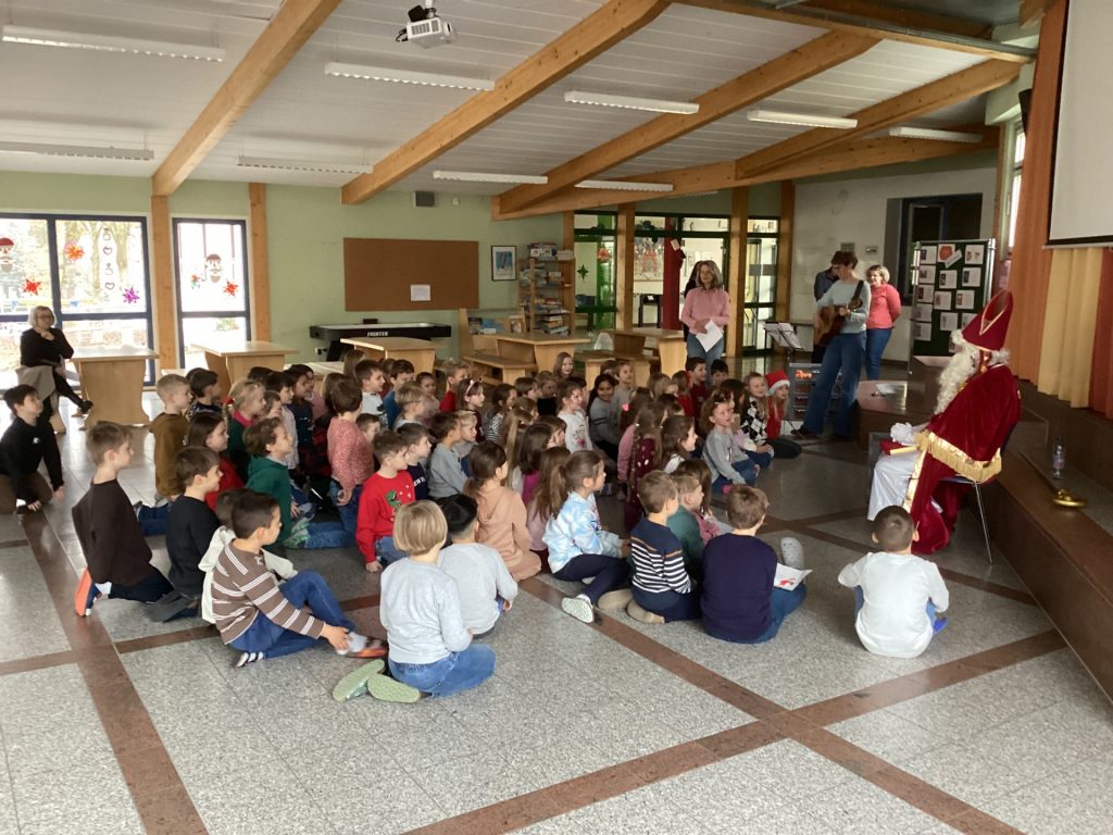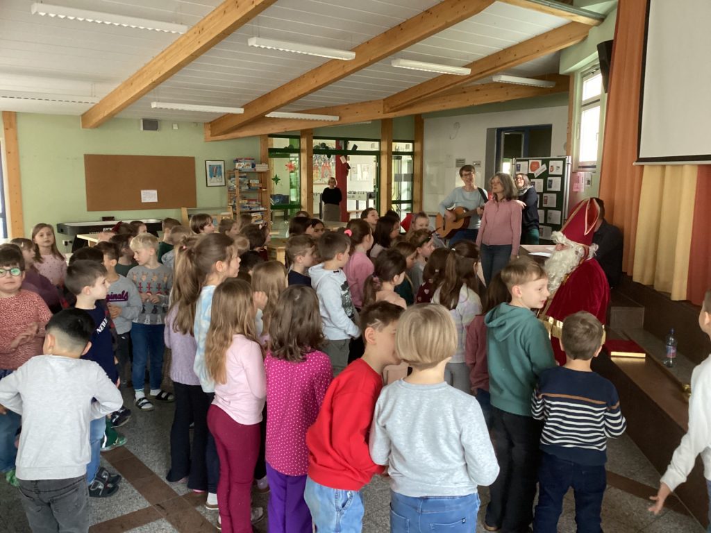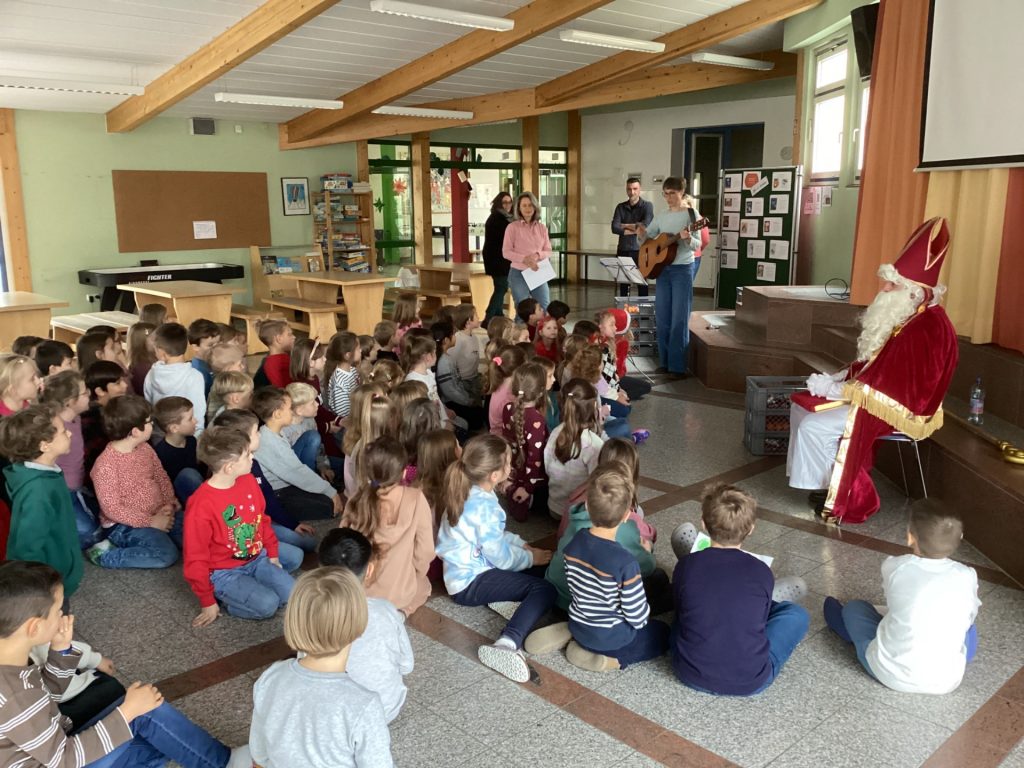 Am 5. Dezember besuchte der Nikolaus unsere Grundschule! Nacheinander versammelten sich die Jahrgangsstufen in der Aula, um den besonderen Gast mit Liedern und Gedichten zu begrüßen. Die Kinder hatten sich sichtlich Mühe gegeben und präsentierten dem Nikolaus ein abwechslungsreiches Programm, das für eine warme, vorweihnachtliche Stimmung sorgte.