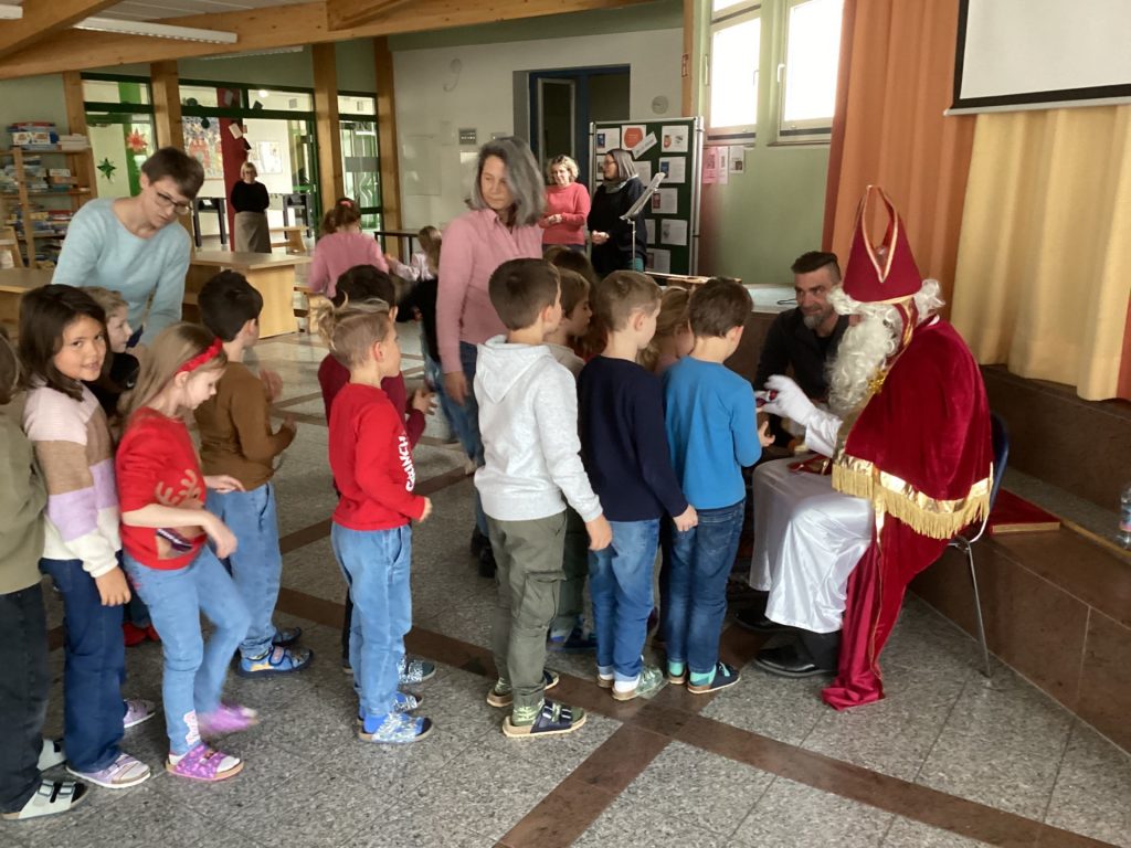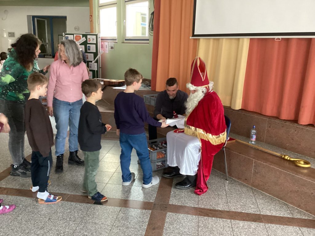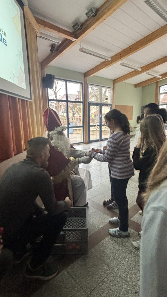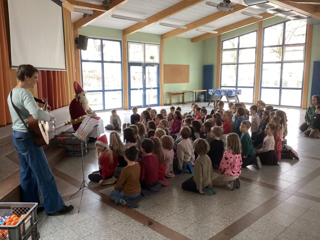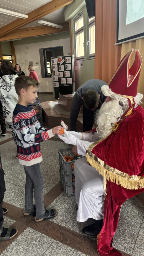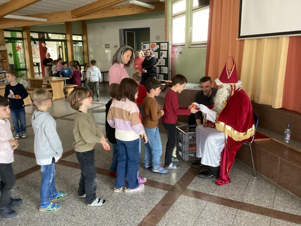 Nach diesen humorvollen, aber freundlichen Worten durfte sich jedes Kind über eine kleine Überraschung freuen. Dank des großzügigen Elternbeirats hatte der Nikolaus für alle ein Geschenk im Sack: einen Schokoladennikolaus und eine Mandarine. Mit dieser leckeren Stärkung fiel das abschließende Singen von „Lasst uns froh und munter sein“ besonders leicht – und die Aula erfüllte sich mit fröhlichen Kinderstimmen.