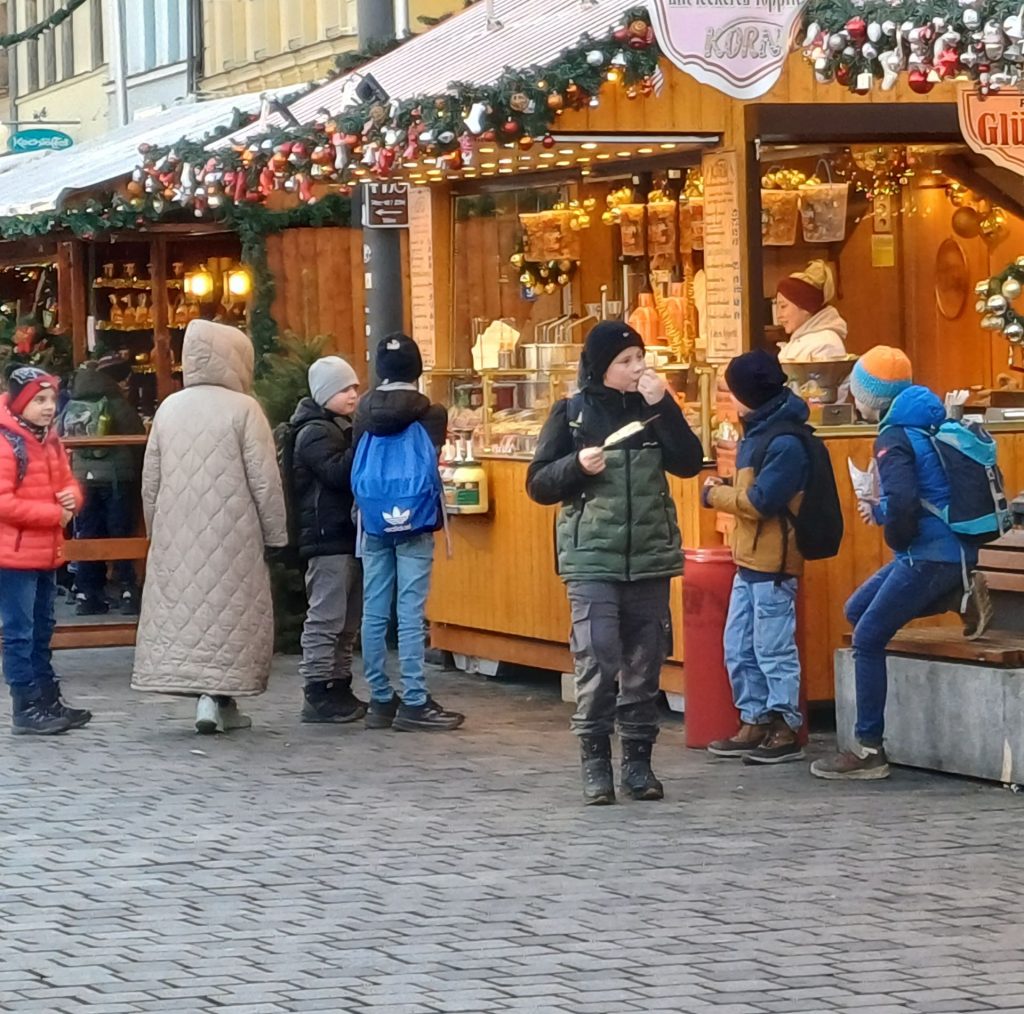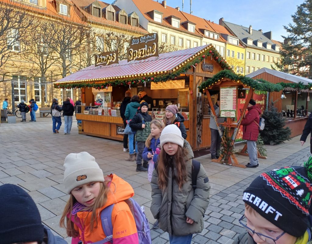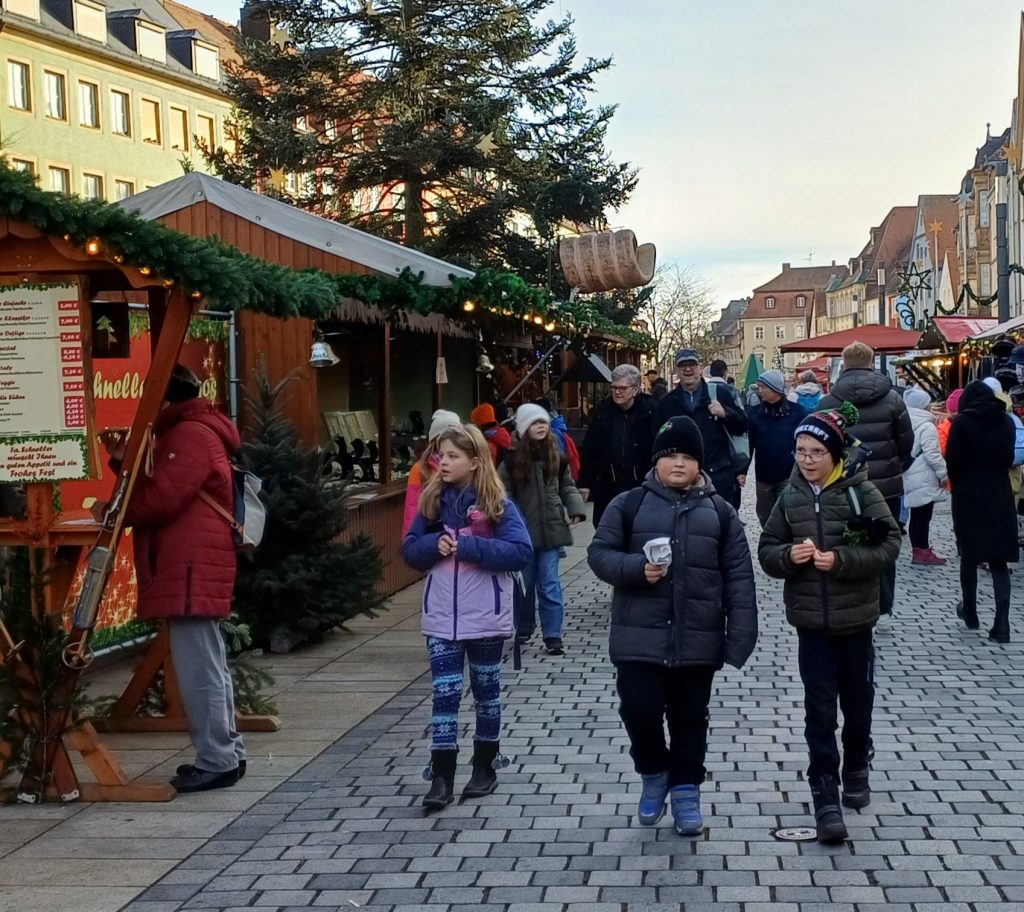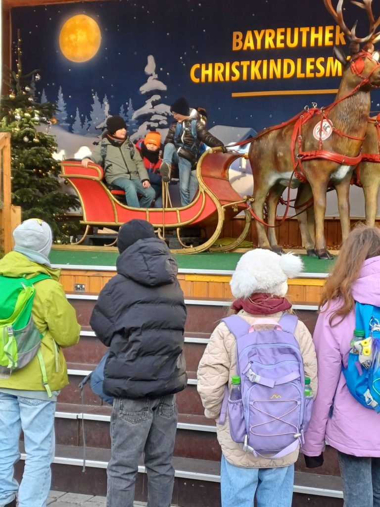 Zur weihnachtlichen Einstimmung unternahmen alle vierten Klassen unserer Schule einen besonderen Ausflug nach Bayreuth. Am Morgen machten wir uns gemeinsam mit dem Bus auf den Weg – die Vorfreude der Kinder war bereits während der Fahrt deutlich zu spüren. Unser erstes Ziel war das Bayreuther Kino. Dort schauten wir den Film „Mission Mäusejagd – Chaos unterm Weihnachtsbaum“, der für viele Lacher und beste Unterhaltung sorgte. Natürlich durfte dabei auch das passende Kinoerlebnis nicht fehlen: Die Schülerinnen und Schüler konnten sich Popcorn und Getränke kaufen und den Film in entspannter Atmosphäre genießen. Nach dem Kinobesuch ging es weiter auf den Bayreuther Christkindlesmarkt. Zwischen festlich geschmückten Ständen, funkelnden Lichtern und weihnachtlichen Düften konnten die Kinder den Markt erkunden und die besondere Adventsstimmung erleben. Der Besuch auf dem Christkindlesmarkt rundete den Ausflug wunderbar ab. Nach Punsch und anderen Leckereien traten wir schließlich die Heimfahrt an. Es war ein rundum gelungener Weihnachtsausflug, der allen Beteiligten viel Freude bereitet hat und den Kindern sicherlich noch lange in schöner Erinnerung bleiben wird.