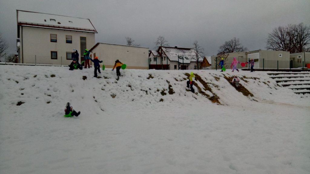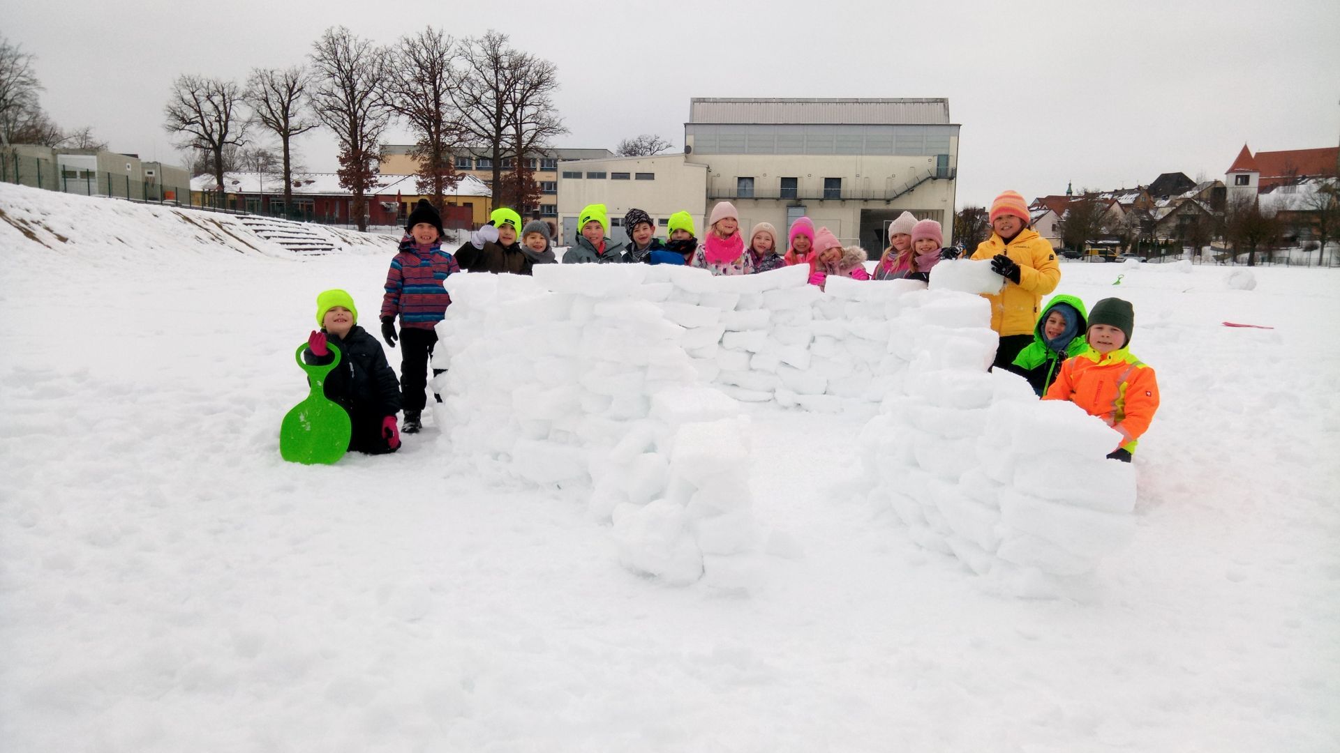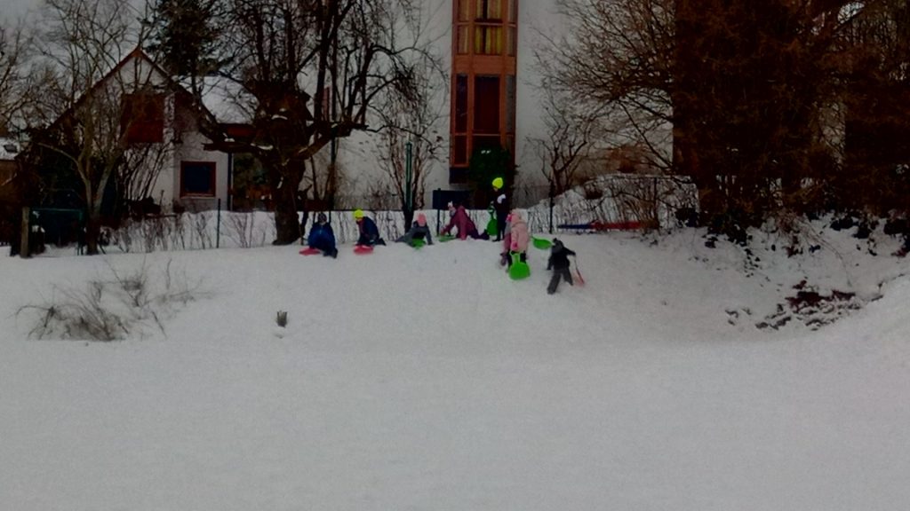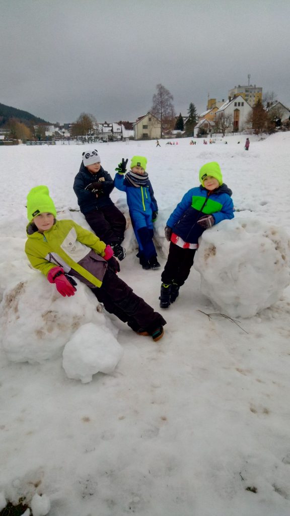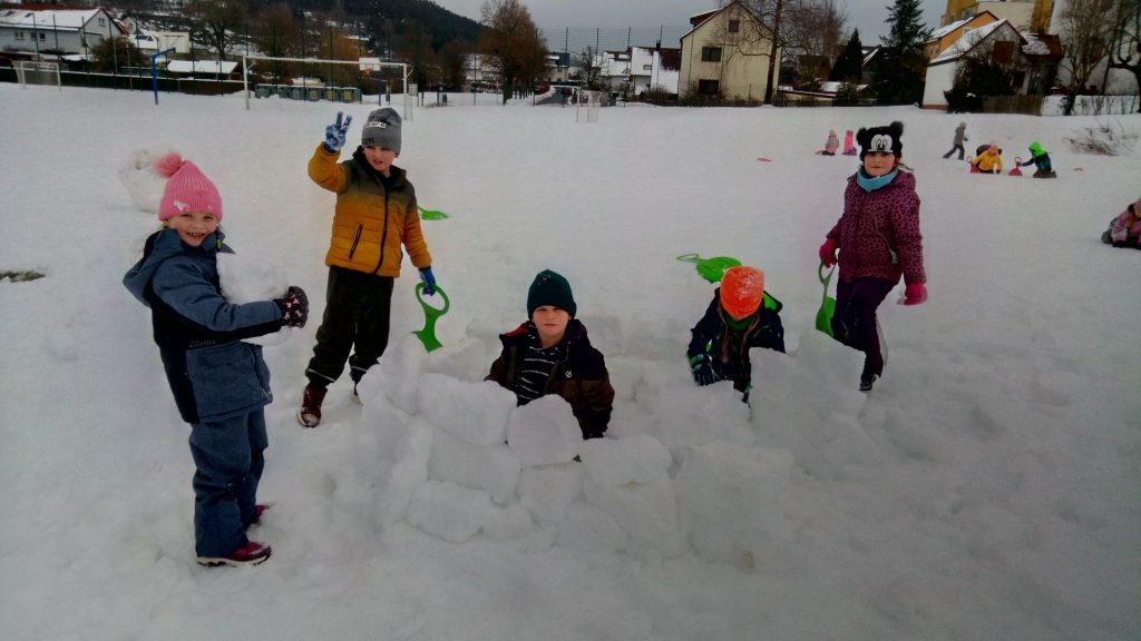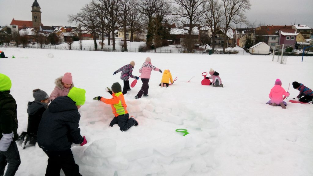 Beste „Pistenverhältnisse“ herrschten am Montag in der Sportstunde der 1b. Zitat: „Das geht ab wie Schnitzel!“ 🙂 Mehr muss dazu nicht gesagt werden 🙂 Außerdem fanden wir heraus, dass die Poporutscher nicht nur zum Fahren geeignet sind, sondern sich auch prima als Bauwerkzeug eignen. Man kann damit hervorragend eckige Bausteine ausstechen und diese für den Bau eines Iglus verwenden. Das Ergebnis kann sich wirklich sehen lassen!
