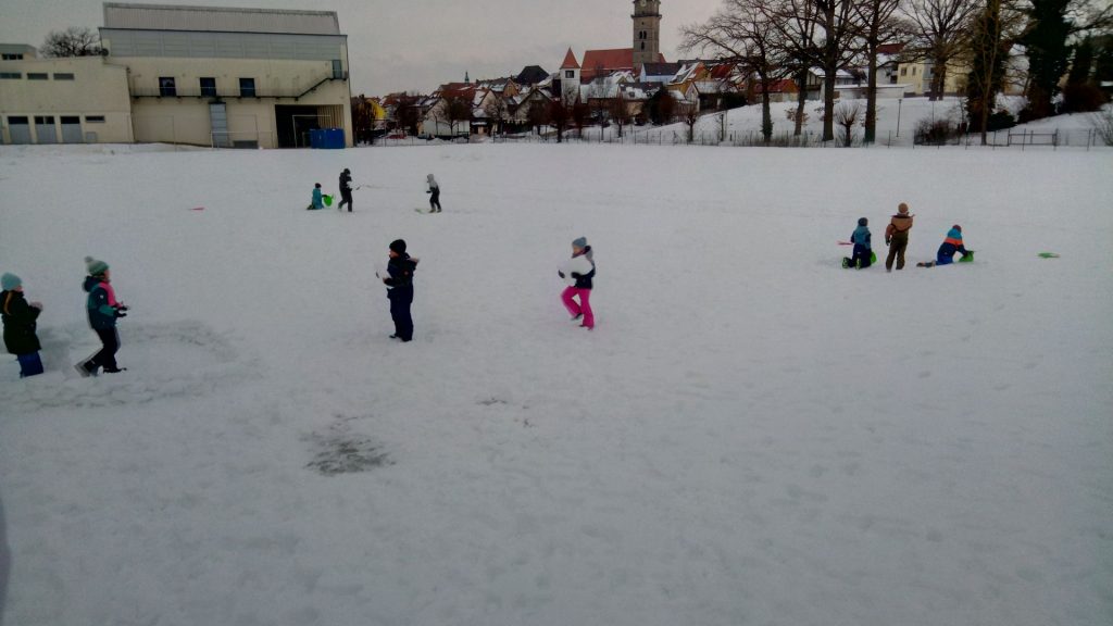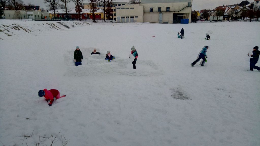 Immer noch liegt genügend Schnee, so dass die 3c (aufgrund der gesperrten Turnhalle) ihre Sportstunde auf dem Sportplatzgelände verbringen konnte. Leider fanden wir die von der 1b liebevoll gebaute Schneeburg völlig zerstört vor. Doch mit vereinten Kräften wurde die alte Burg, diesmal sogar mit einem großen Erweiterungsbau, wieder aufgestellt. Alle halfen zusammen. Eine Gruppe stellte die Bausteine mit als Säge umfunktionierten Poporutschern her. Eine andere Gruppe waren die Lieferanten und dann gab es natürlich noch die Baumeister 🙂 Wir hoffen einfach, dass unsere tolle Burg am Freitag noch steht. Denn dann wollen wir mit dem Innenausbau beginnen.