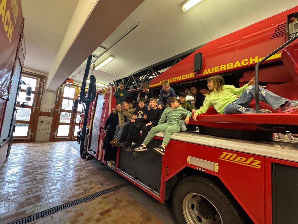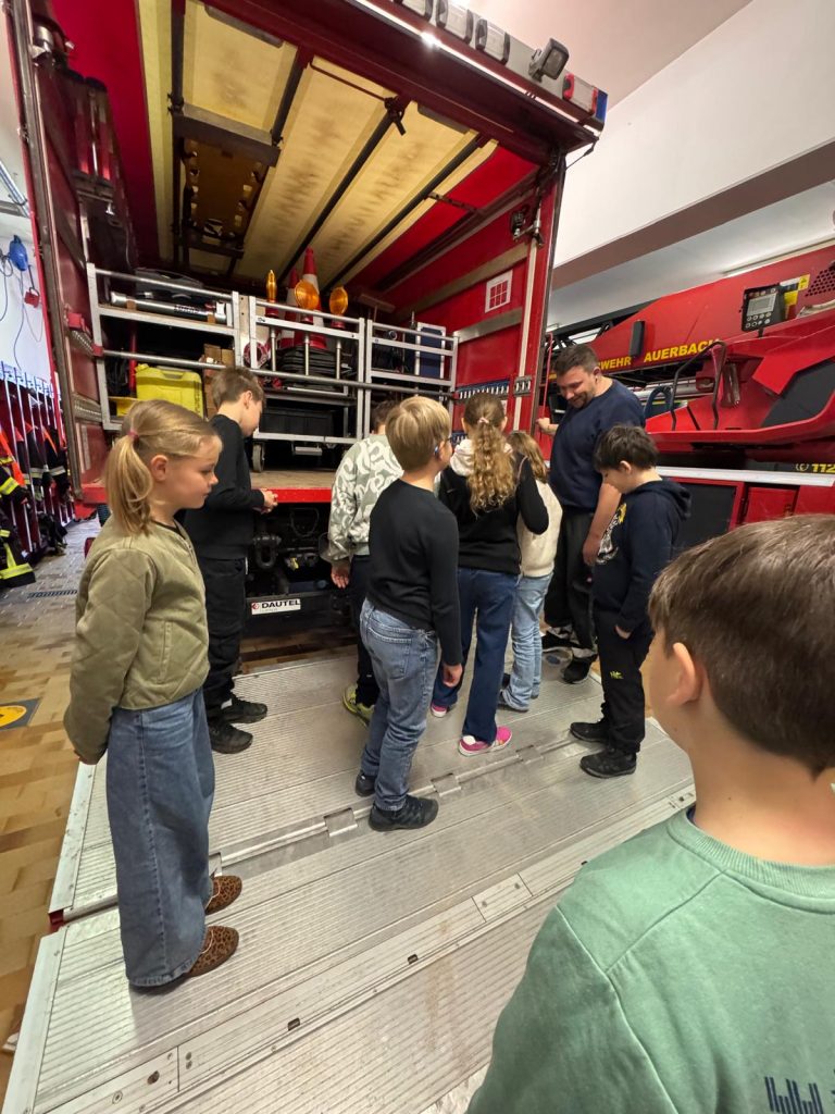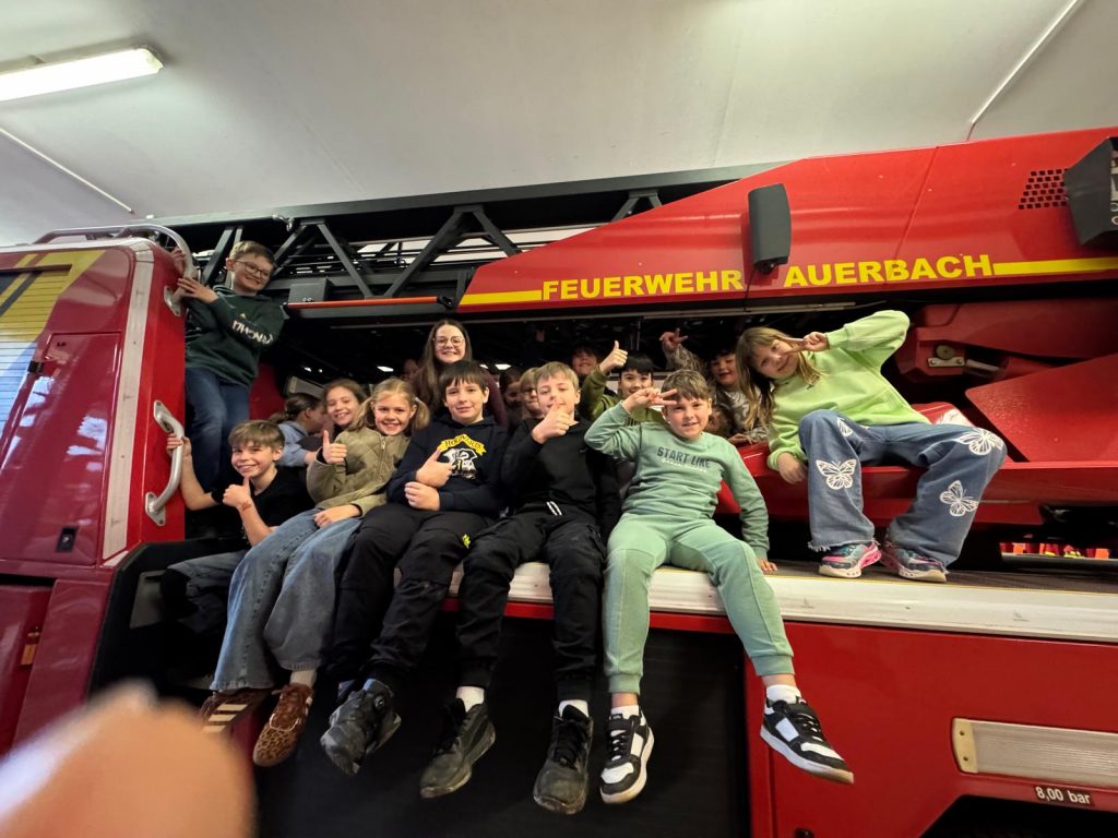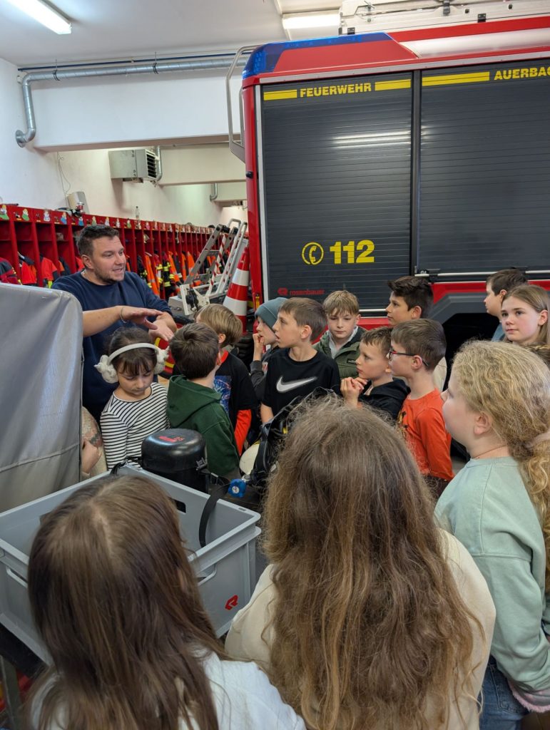 Heute war ein besonderer Tag bei der Dr. Heinrich-Stromer-Grundschule in Auerbach: die Feuerwehr öffnete ihre Türen für die Drittklässler. Herr Sporrer erklärte den Kindern die Arbeit der Feuerwehr und zeigte, welche Aufgaben auch fernab von Einsätzen zu erledigen sind. Die Schülerinnen und Schüler durften die großen Einsatzfahrzeuge bestaunen und erfuhren, welche Geräte und Werkzeuge bei Bränden oder Unfällen zum Einsatz kommen. Besonders spannend war der Einblick in die Feuerwehrautos, die sonst nur im Einsatz zu sehen sind. Der ein oder andere Lernende hat es sich hinter dem Steuer bereits gemütlich gemacht. Neben dem Trocknungsturm konnten die Drittklässler auch die längste Badewanne Auerbachs begutachten, die Waschstraße, in der die Schläuche gesäubert werden. Ein besonderes Highlight war die Rückfahrt zur Schule in den zwei Einsatzwägen. Als krönenden Abschluss gab es mit perfektem Timing am Ende des Besuchs einen echten Alarm – was für ein Zufall. Das erlebt man wahrlich nicht alle Tage.