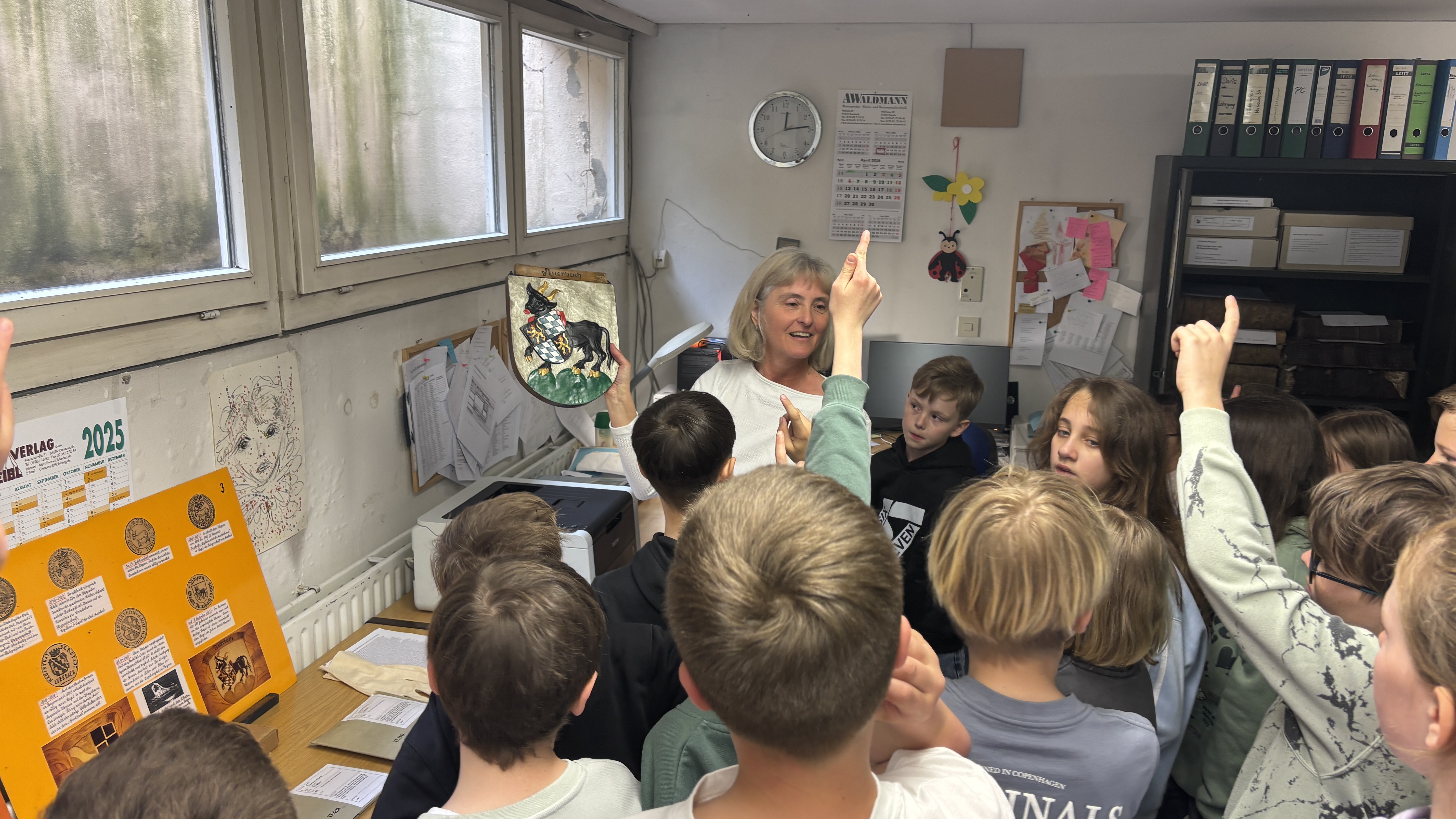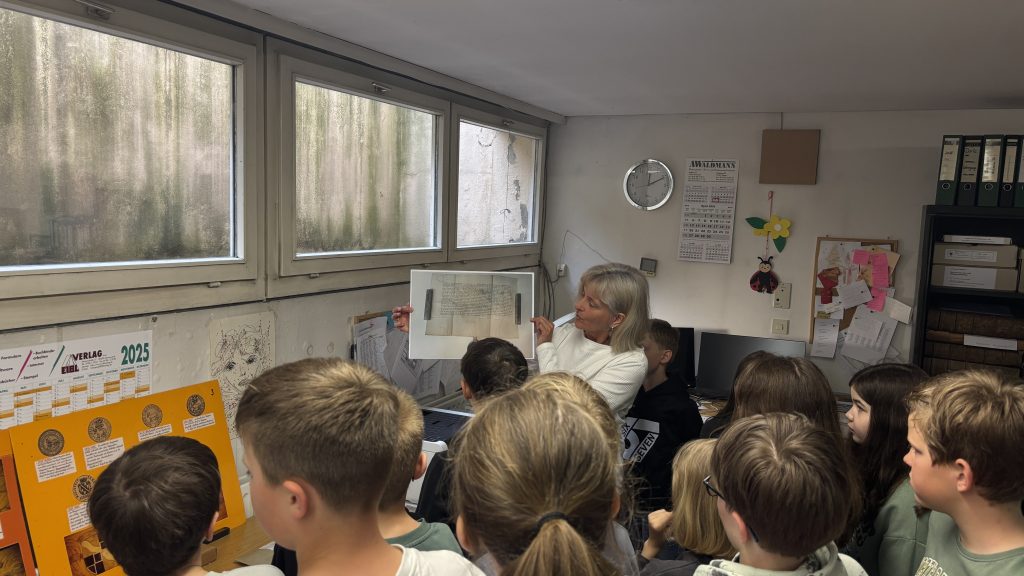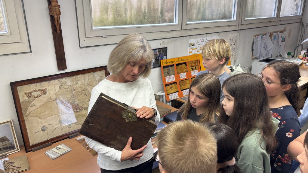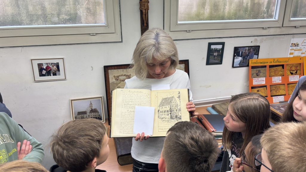 Im Rahmen des Heimat- und Sachunterrichts zum Thema „Geschichte Auerbachs“ besuchten die vierten Klassen das Stadtarchiv. Frau Bundscherer begrüßte alle herzlich im Stadtarchiv, das sie treffend als das „Gedächtnis der Stadt Auerbach“ bezeichnete.