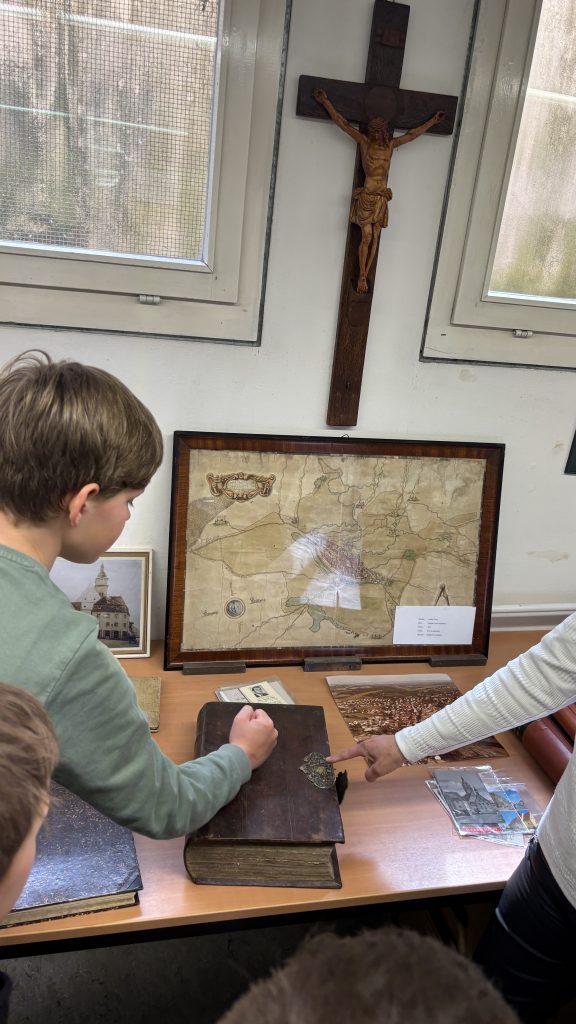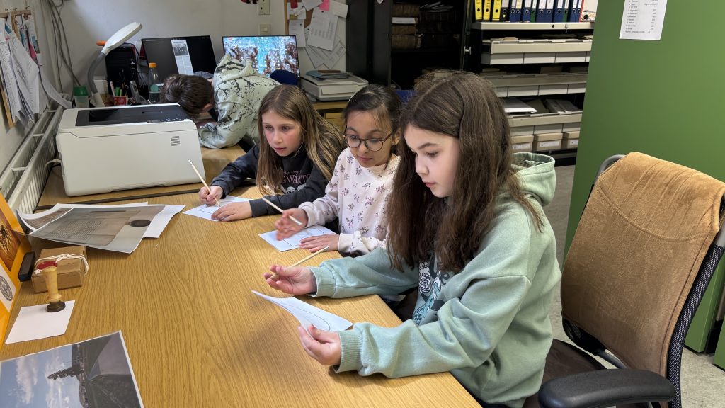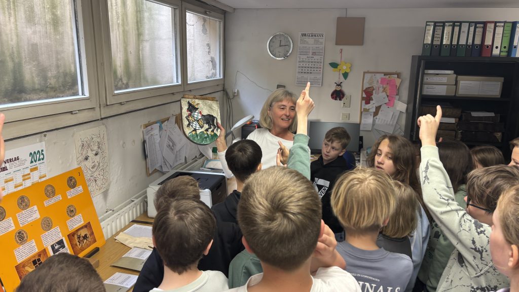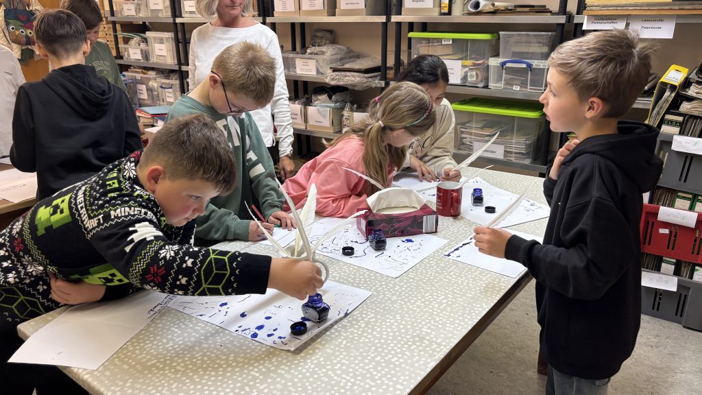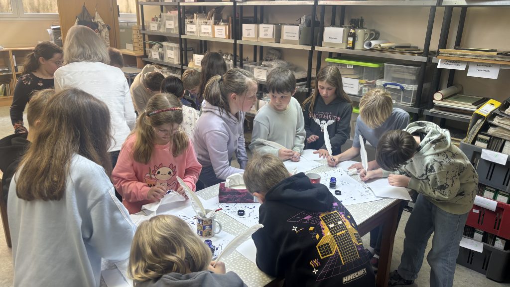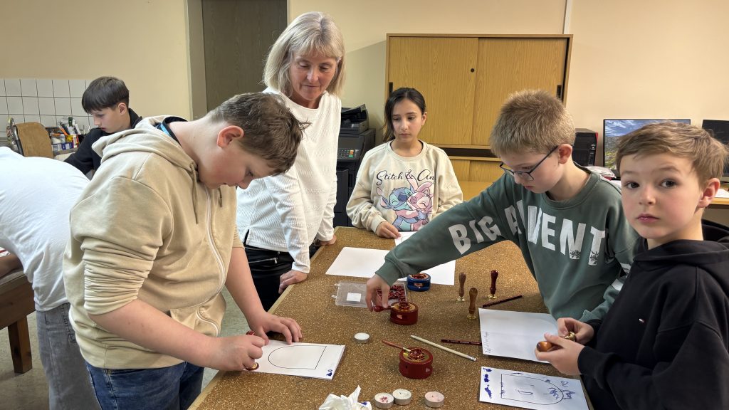 Im anschließenden kreativen Teil konnten die Kinder an drei spannenden Stationen selbst aktiv werden: Sie entwarfen eigene (Familien-)Wappen, probierten das Schreiben mit Feder und Tinte aus und durften ihre Werke zum Abschluss sogar mit einem echten Wachssiegel besiegeln.